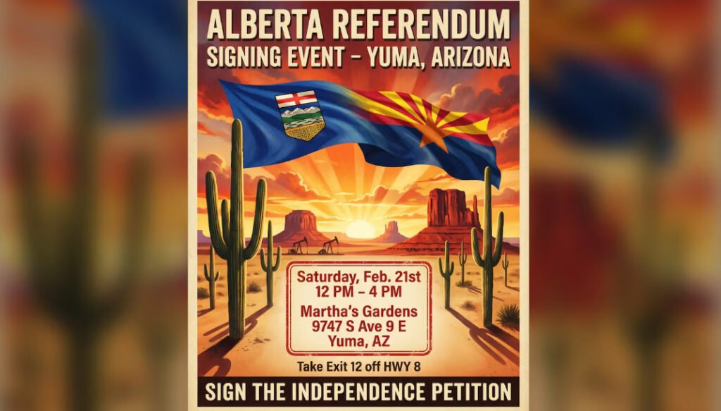 കാനഡയിൽ നിന്നും ആൽബർട്ട പ്രവിശ്യയെ വേർപെടുത്തണമെന്ന ആവശ്യവുമായി പ്രവർത്തിക്കുന്ന ‘സ്റ്റേ ഫ്രീ ആൽബർട്ട’ പ്രസ്ഥാനത്തിന്റെ നേതൃത്വത്തിൽ അമേരിക്കയിലെ അരിസോണയിൽ പ്രത്യേക ഒപ്പുശേഖരണ പരിപാടി നടത്താൻ ഒരുങ്ങുന്നു. ശീതകാലം ചെലവഴിക്കാൻ അരിസോണയിലെത്തിയ ആൽബർട്ടൻ സ്വദേശികളെ (സ്നോബേർഡ്സ്) ലക്ഷ്യമിട്ടാണ് ഈ വാരാന്ത്യത്തിൽ യുമയിലെ മാർത്താസ് ഗാർഡൻസ് ഡേറ്റ് ഫാമിൽ വെച്ച് പരിപാടി നടക്കുന്നത്. ഫെബ്രുവരി 21-ന് ഉച്ചയ്ക്ക് 12 മുതൽ വൈകിട്ട് 4 വരെ നടക്കുന്ന ചടങ്ങിൽ, അൽബർട്ട ഒരു സ്വതന്ത്ര രാഷ്ട്രമാകണമെന്ന പ്രമേയത്തിന്മേലുള്ള റഫറണ്ടം ഹർജിയിലാണ് ഒപ്പുകൾ ശേഖരിക്കുക.