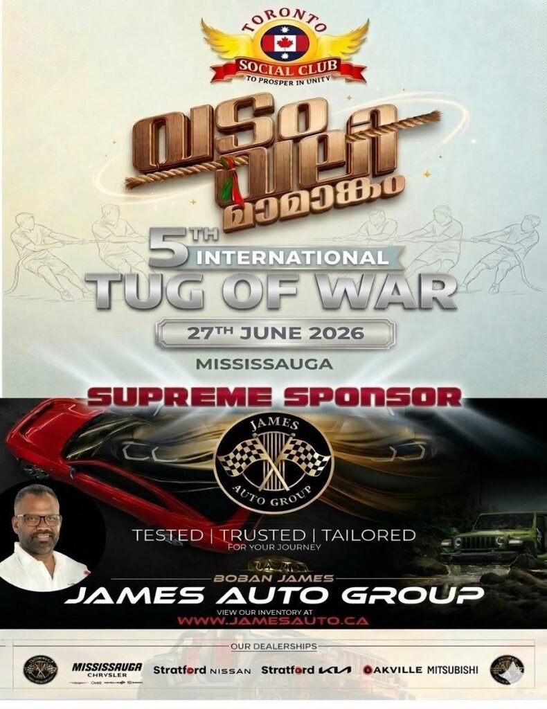 മിസ്സിസാഗ നഗരത്തെ ആവേശത്തിലാഴ്ത്താന് ടൊറൻ്റോ സോഷ്യല് ക്ലബിന്റെ അഞ്ചാമത് അന്താരാഷ്ട്ര വടംവലി മാമാങ്കം ജൂണ് 27ന് നടക്കും. ലോകത്തിന്റെ വിവിധ ഭാഗങ്ങളില് നിന്നുള്ള ടീമുകള് മാറ്റുരയ്ക്കുന്ന ഈ ആവേശകരമായ മത്സരത്തില് പങ്കുചേരാനും നേരിട്ട് കണ്ട് ആസ്വദിക്കാനും ഏവരെയും സംഘാടകര് സ്വാഗതം ചെയ്തു. മലയാളികള് കാത്തിരിക്കുന്ന ഈ വടംവലി മഹോത്സവത്തിന്റെ മുഖ്യ സ്പോണ്സര് പ്രമുഖ വ്യവസായിയും ജയിംസ് ഓട്ടോ ഗ്രൂപ്പ് സിഇഒയുമായ ബോബന് ജയിംസ് ആണ്.