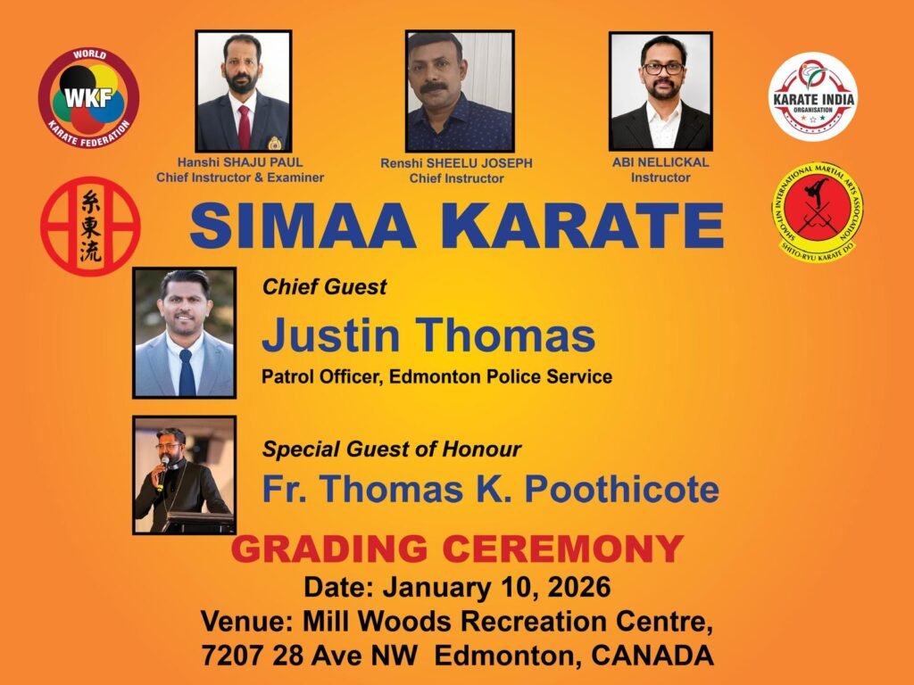 എഡ്മിന്റൻ : നഗരത്തിലെ പ്രമുഖ കരാട്ടെ പരിശീലന കേന്ദ്രമായ SIMAA കരാട്ടെ എഡ്മിന്റൻ ജനുവരി പത്ത് ശനിയാഴ്ച കരാട്ടെ ബെൽറ്റ് ഗ്രേഡിംഗ് ചടങ്ങ് വിജയകരമായി സംഘടിപ്പിച്ചു. സംഘടനയുടെ വളർച്ചയിലേക്കുള്ള മറ്റൊരു അഭിമാനകരമായ നേട്ടമായ ഈ ചടങ്ങിൽ മുപ്പതിലധികം കുട്ടികൾ പുതിയ ബെൽറ്റ് നിലവാരങ്ങളിലേക്ക് ഉയർന്നു. കുട്ടികളുടെ അദ്ധ്വാനം, ശിസ്തം, സ്ഥിരമായ പരിശീലനം എന്നിവയെ അംഗീകരിക്കുന്നതിനായാണ് ഈ ചടങ്ങ് നടന്നത്. സന്തോഷവും ആവേശവും നിറഞ്ഞ അന്തരീക്ഷത്തിൽ നടന്ന ചടങ്ങിൽ രക്ഷിതാക്കളും കുടുംബാംഗങ്ങളും സുഹൃത്തുക്കളും ഉൾപ്പെടെ നിരവധി പേർ പങ്കെടുത്തു. കുട്ടികൾ പരിപാടിയുടനീളം പ്രകടിപ്പിച്ച ആത്മവിശ്വാസവും ശിസ്തവും ആവേശവും SIMAA കരാട്ടെ പിന്തുടരുന്ന ഉയർന്ന പരിശീലന നിലവാരവും മൂല്യാധിഷ്ഠിത സമീപനവും വ്യക്തമായി പ്രതിഫലിപ്പിച്ചു. എഡ്മിന്റനിൽ SIMAA കരാട്ടെ സംഘടിപ്പിക്കുന്ന മൂന്നാമത്തെ ബെൽറ്റ് ഗ്രേഡിംഗ് ചടങ്ങ് ആണിത്. ഇതിലൂടെ സംഘടനയുടെ സ്ഥിരതയുള്ള വളർച്ചയും പ്രാദേശിക സമൂഹത്തിൽ ഉണ്ടാകുന്ന അനുകൂല സ്വാധീനവും വ്യക്തമാകുന്നു.
